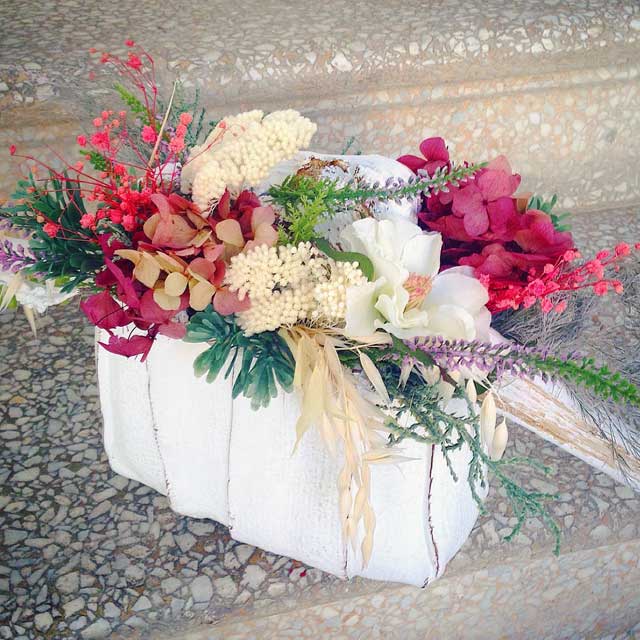 [vc_empty_space height=”32px” image_repeat=”no-repeat”][vc_column_text]Centro floral en recipiente de cerámica con flor seca, preservada y artificial.