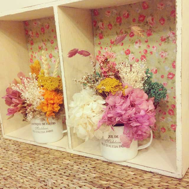 [vc_empty_space height=”32px” image_repeat=”no-repeat”][vc_column_text]Bonitas tazas de metal decoradas con flor seca y preservada.