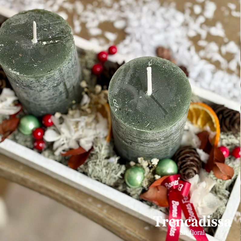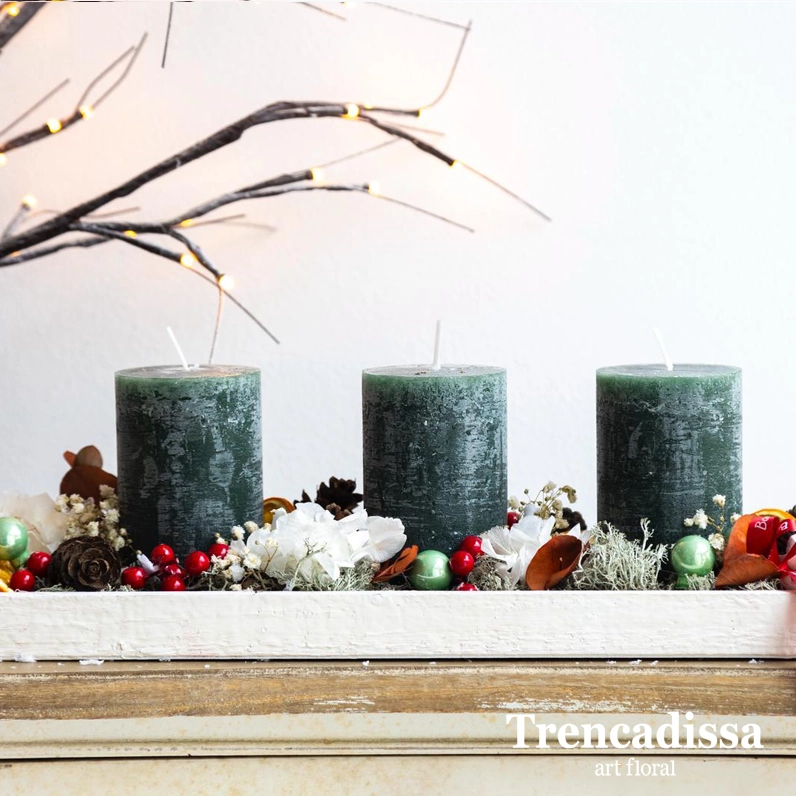 Centro navideño en tonos verdes con tres velas.